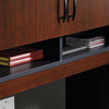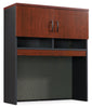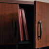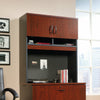 Add a little extra style and a whole lot of extra storage to your office space with this Via hutch. Behind its two doors is a hidden storage space that provides you with a convenient area to stow away office items that you prefer to be tucked away. It also includes cubbyholes that offer space for smaller office supplies like envelopes and notepads. Plus, the fabric-covered bulletin board makes it easy to hang a calendar, important notes and a few pictures. Finished in classic cherry with a black frame, this hutch will give your space a professional look.