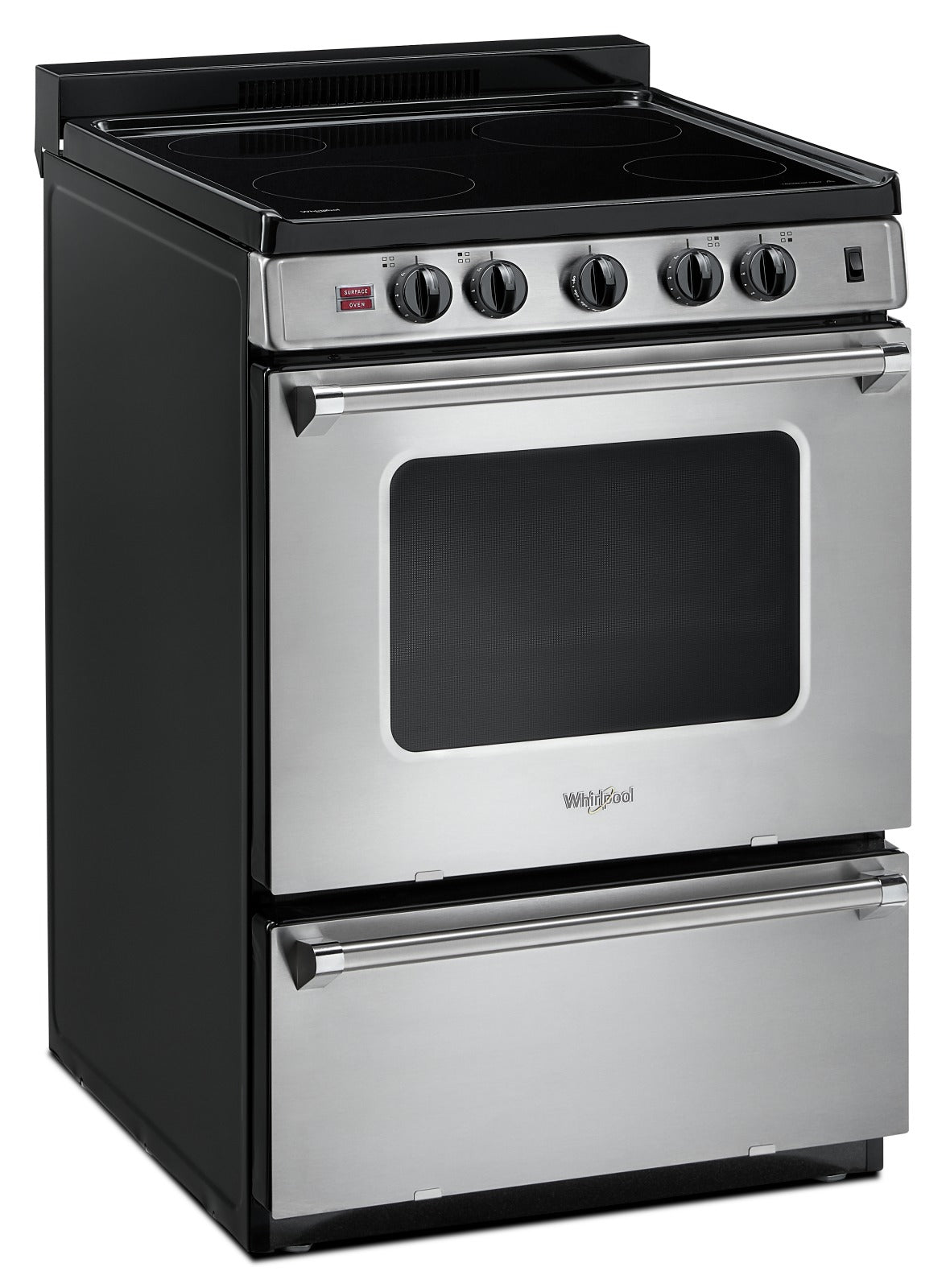 Serve up something for everyone, even in tight kitchens, with this Whirlpool 24-inch electric range. When messes happen, the upswept porcelain-coated steel cooktop easily wipes clean and contains spills, so you can save time cleaning up. Conveniently store your pots and pans in the storage drawer located directly under the oven to amplify the cabinet space in smaller kitchens. Perfect for apartments and condos, this compact range is a space-saving solution that doesn’t compromise on style and power.
