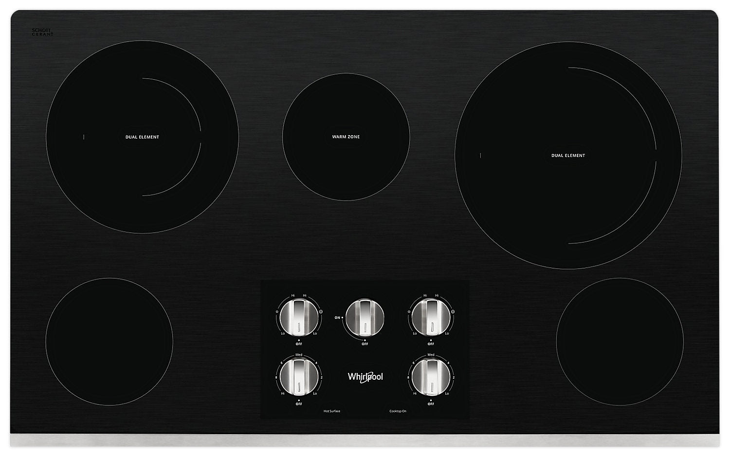 This 36-inch Whirlpool electric ceramic glass cooktop makes dinner time easy, even when you’re serving picky eaters. You can fry, steam and sizzle your favourite foods all at once with a fifth element and two FlexHeat™ dual radiant elements that make cooking multiple dishes simple. And for even more flexibility - the Warm Zone element keeps food hot and ready to serve while you're finishing the rest of the meal. When it’s time to clean up, easily wipe messes off the ceramic glass surface.
