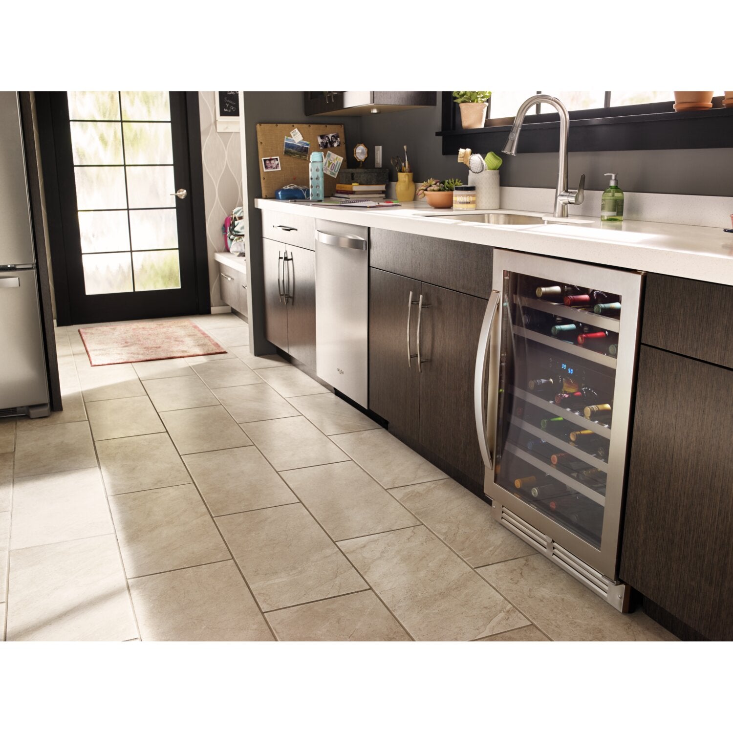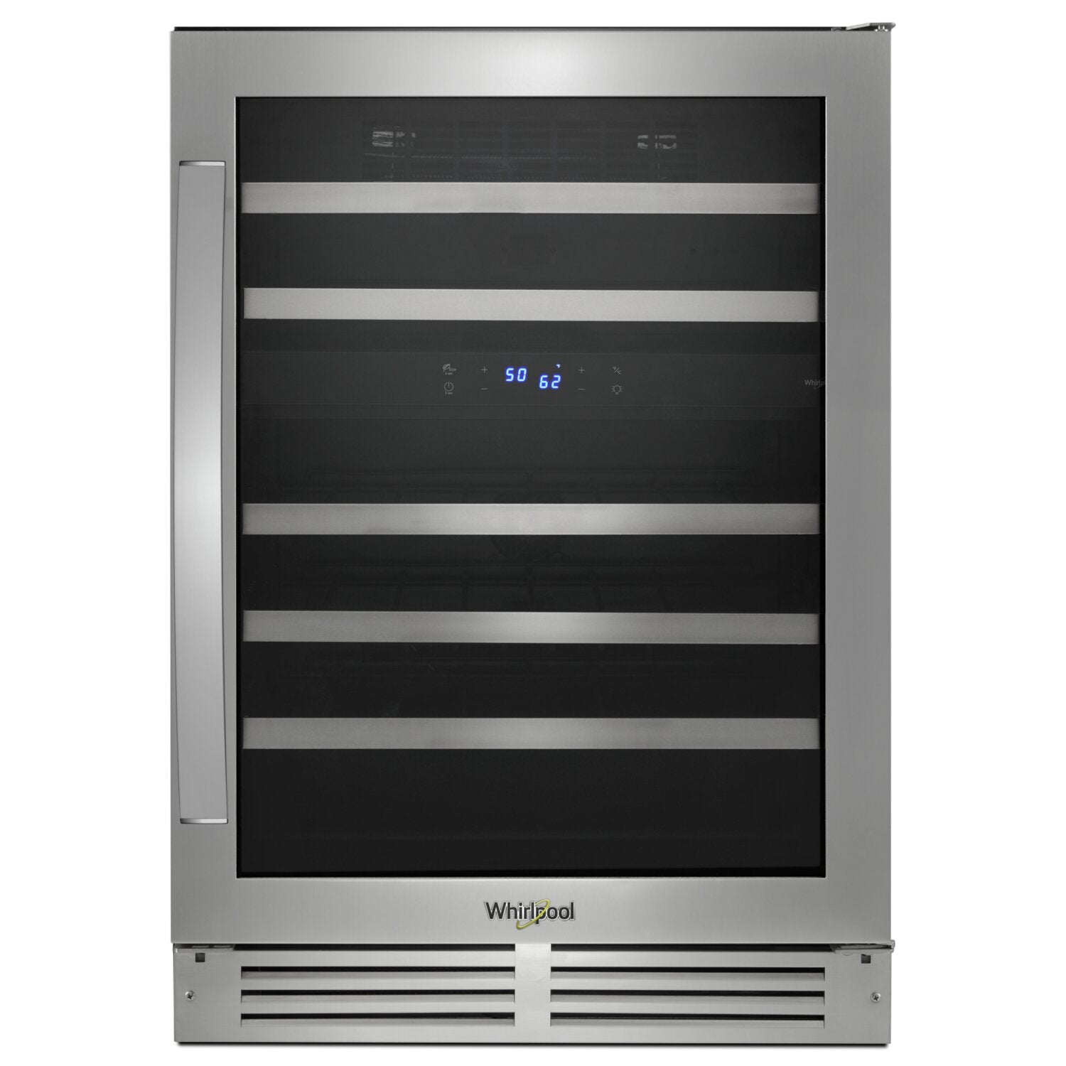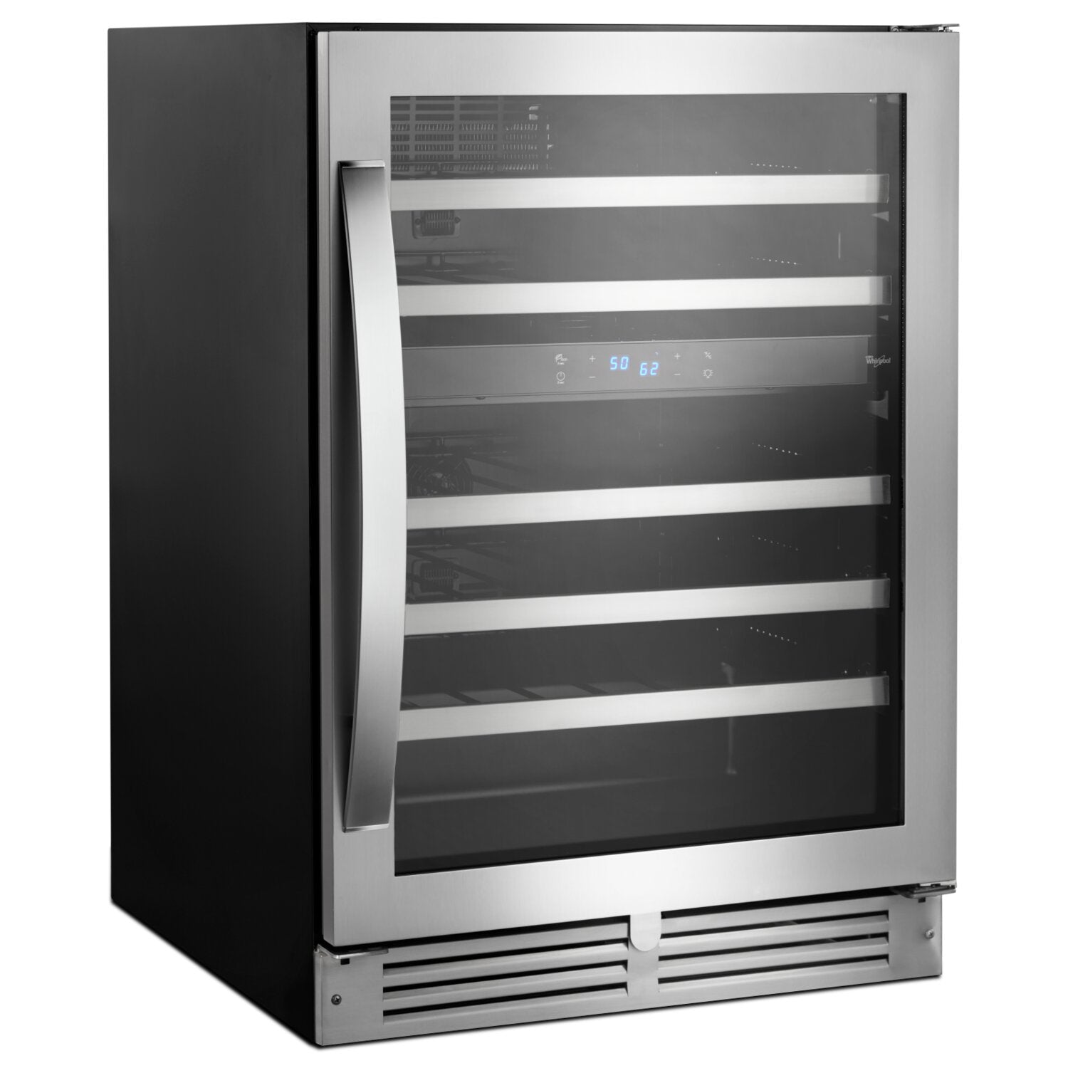 Keep your wine selection stored in style with this under-counter wine cooler from Whirlpool. This massive 46-bottle refrigerator is perfect for keeping your entire collection organized and cared for. With two temperature-controlled zones, you can confidently keep all your favourite beverages at their optimal temperatures. A reversible glass door can be installed on the right or left, so the placement options are endless. Plus, fingerprint-resistant stainless steel is easy to wipe clean and maintain shine.
