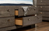 Embrace the feeling of contemporary style with the Yorkdale grey queen six-piece storage bedroom package. The soft grey finish made from engineered wood creates a neutral base to pair perfectly with almost any room decor. A dozen drawers built into the lower half of the bed help you keep extra blankets or pyjamas close at hand. Rectangular pewter drawer pulls and a large square mirror add a burst of sparkle to the ample amount of storage space. Let the sleek, modern design of the Yorkdale grey bedroom help you build the perfect space for rest and relaxation.